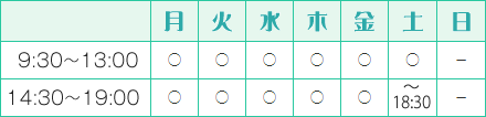 平日 9:30~19:00 土 9:30~18:30 日・祝休診 お子様からご年配の方までお気軽にご相談ください 駐車場完備・バリアフリー・保育スペース・車イス有